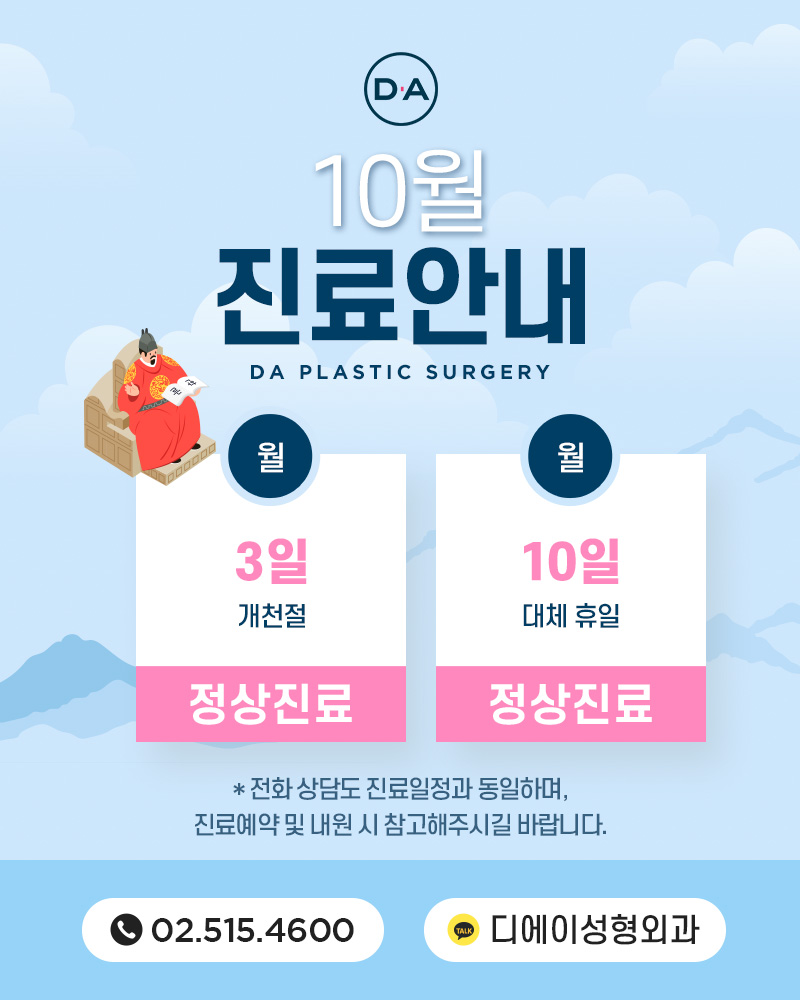 디에이성형외과의원은 회원인증과 관련 암호알고리즘을 이용하여 네트워크 상의 개인정보를 안전하게 전송할 수 있는 인증 및 보안장치를 채택하고 있으며, 시스템상 사정에 의해 미시행시 도우미에 의한 의사 확인을 시행하고 있습니다.