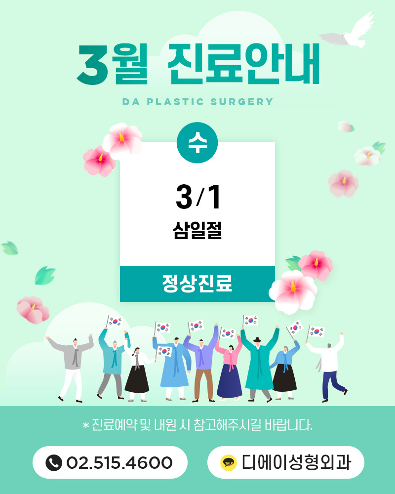 디에이성형외과의원은 회원인증과 관련 암호알고리즘을 이용하여 네트워크 상의 개인정보를 안전하게 전송할 수 있는 인증 및 보안장치를 채택하고 있으며, 시스템상 사정에 의해 미시행시 도우미에 의한 의사 확인을 시행하고 있습니다.