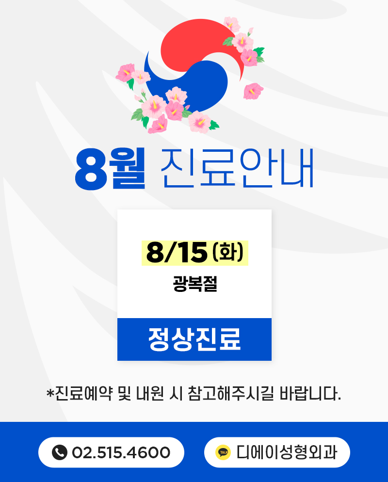 디에이성형외과의원은 회원인증과 관련 암호알고리즘을 이용하여 네트워크 상의 개인정보를 안전하게 전송할 수 있는 인증 및 보안장치를 채택하고 있으며, 시스템상 사정에 의해 미시행시 도우미에 의한 의사 확인을 시행하고 있습니다.
