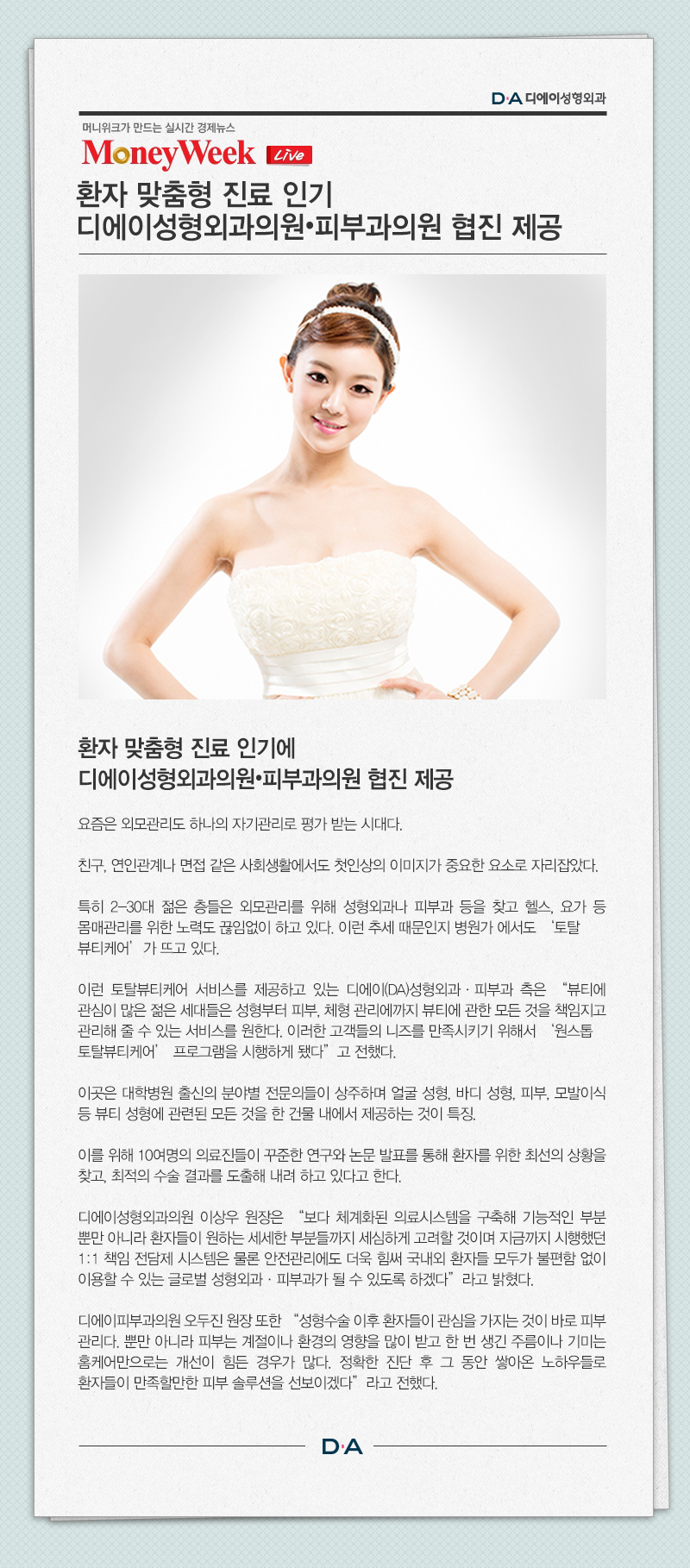 환자 맞춤형 진료 인기 디에이성형외과의원·피부과의원 협진 제공
