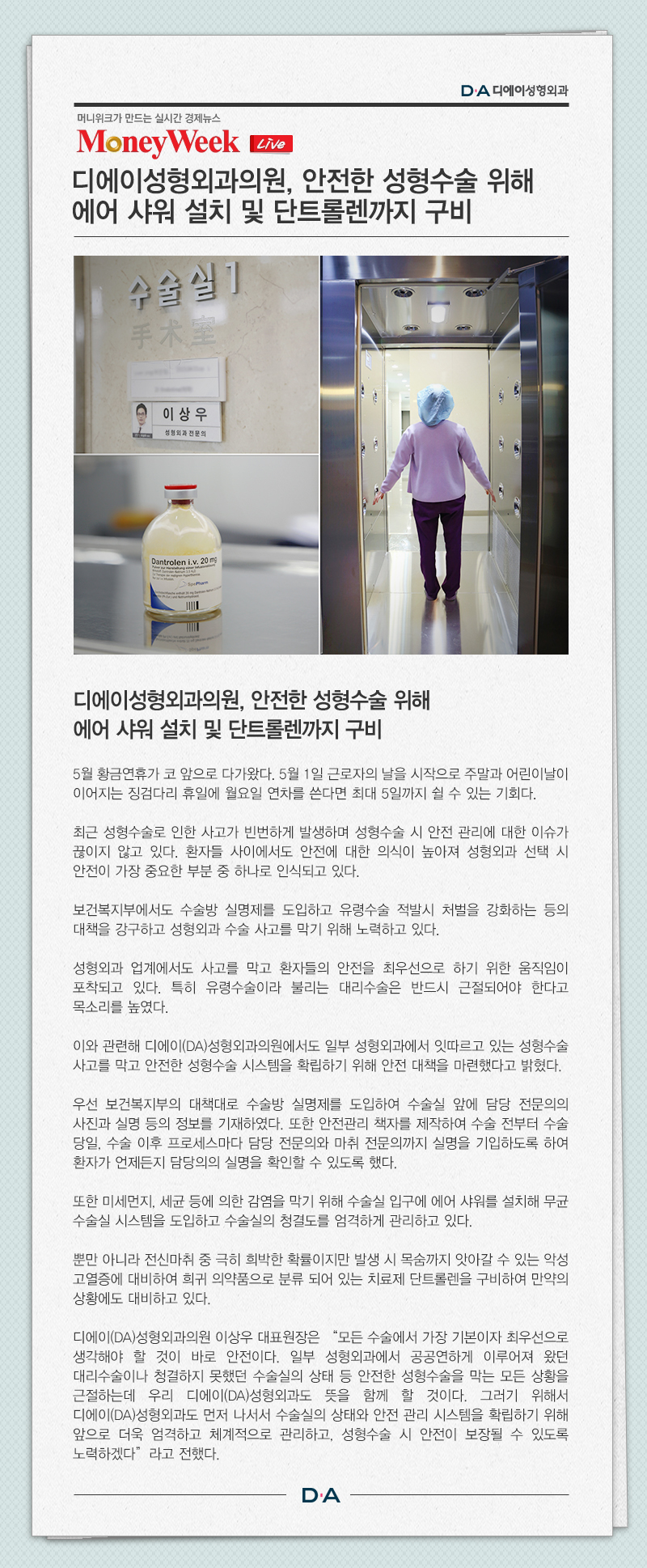 디에이성형외과의원, 안전한 성형수술 위해 에어 샤워 설치 및 단트롤렌까지 구비