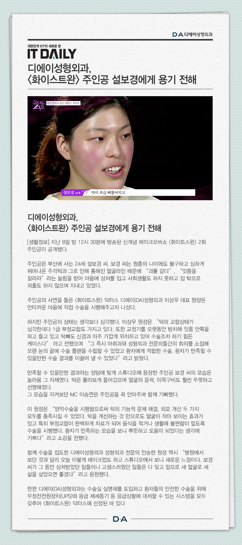 디에이성형외과, <화이트스완> 주인공 설보경에게 용기 전해
