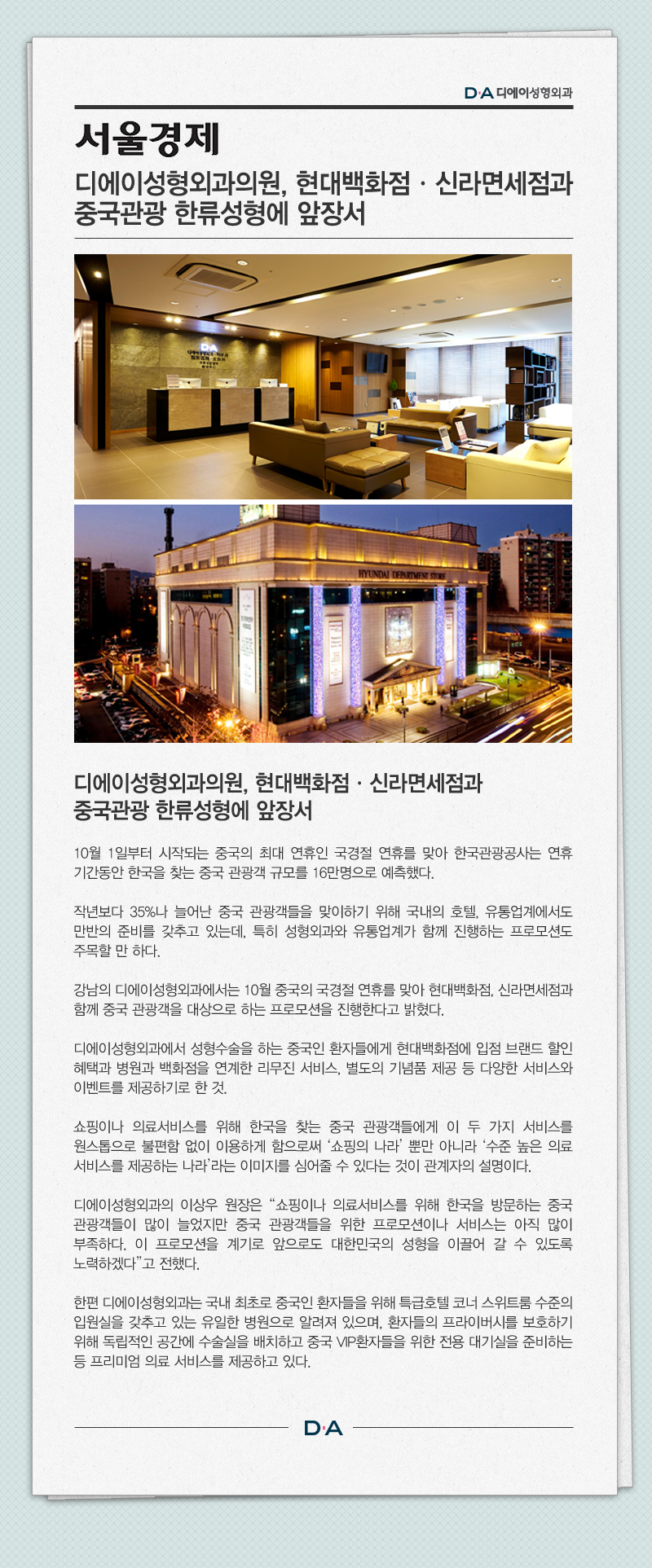 디에이성형외과의원, 현대백화점·신라면세점과 중국관광 한류성형에 앞장서