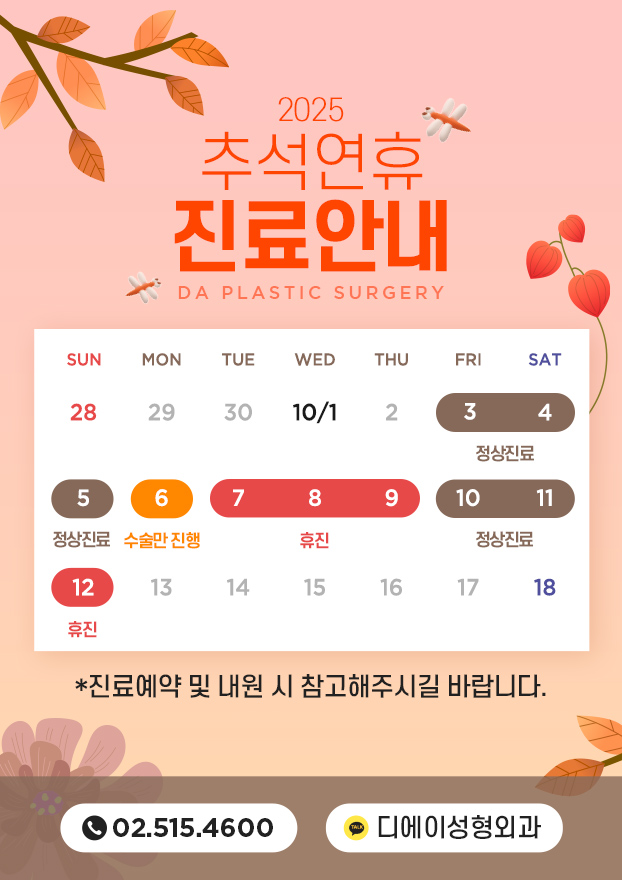 디에이성형외과의원은 회원인증과 관련 암호알고리즘을 이용하여 네트워크 상의 개인정보를 안전하게 전송할 수 있는 인증 및 보안장치를 채택하고 있으며, 시스템상 사정에 의해 미시행시 도우미에 의한 의사 확인을 시행하고 있습니다.