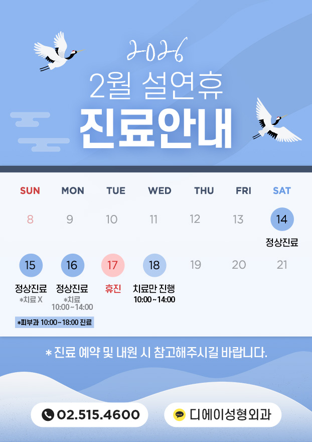 디에이성형외과의원은 회원인증과 관련 암호알고리즘을 이용하여 네트워크 상의 개인정보를 안전하게 전송할 수 있는 인증 및 보안장치를 채택하고 있으며, 시스템상 사정에 의해 미시행시 도우미에 의한 의사 확인을 시행하고 있습니다.